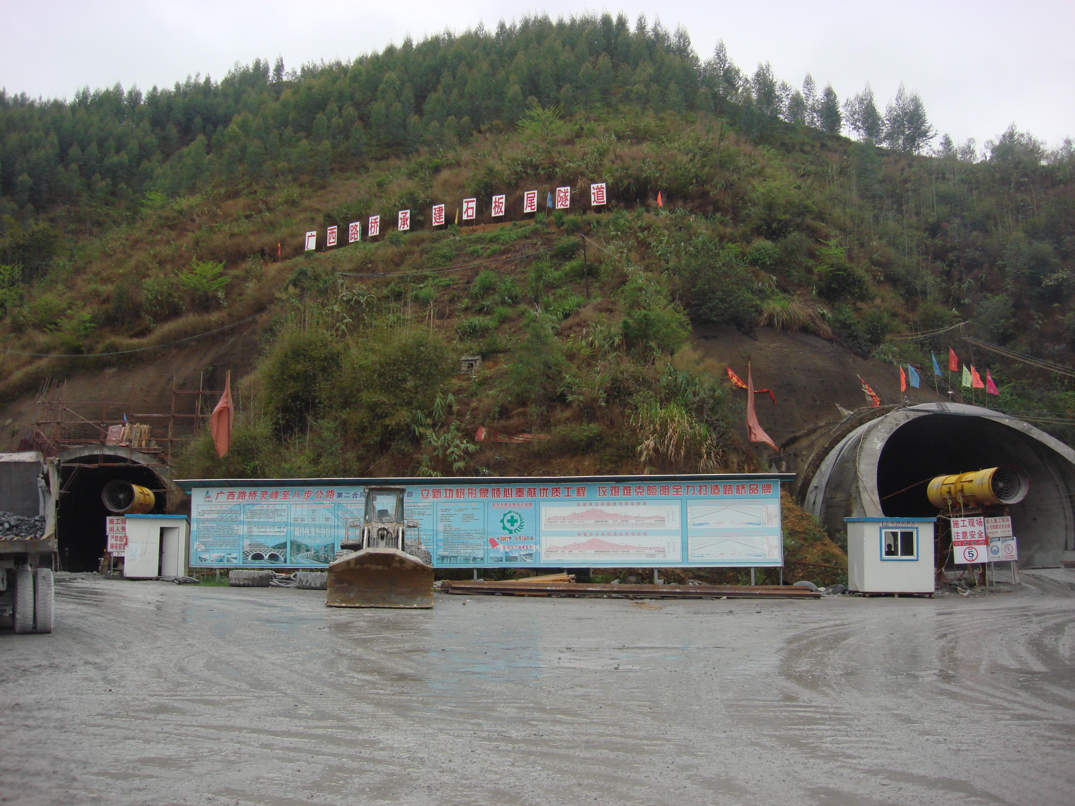 本工程路線起于廣西六寨,終止于廣西河池,接在建的桂梧高速公路賀州支線終點(diǎn),路線全長76.427公里。路線全線位于賀州境內(nèi),經(jīng)過的主要鄉(xiāng)鎮(zhèn)有靈峰鎮(zhèn)、信都鎮(zhèn)、大桂山林場(chǎng)、步頭鎮(zhèn)、蓮塘鎮(zhèn)和沙田鎮(zhèn)。主線全線采用雙向四車道高速公路標(biāo)準(zhǔn),設(shè)計(jì)速度100kN/h,路基寬度26.0m,橋涵設(shè)計(jì)汽車荷載采用公路-Ⅰ級(jí)。本項(xiàng)目共有隧道四座,分別為花墳洞隧道(362m、連拱、土建一標(biāo)施工段內(nèi))、石板尾隧道(左線3180、右線3175m、分離式、土建二標(biāo)施工段內(nèi))、大桂山隧道(左線1860m、右線1680m、分離式、土建四標(biāo)施工段內(nèi))、湴田隧道(430m、連拱、土建五標(biāo)施工段內(nèi))。區(qū)間隧道采用礦山法施工,洞身襯砌按新奧法設(shè)計(jì),采用柔性支護(hù)體系結(jié)構(gòu)的復(fù)合式襯砌。