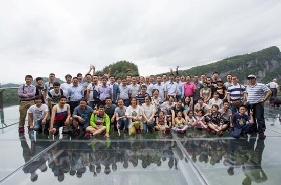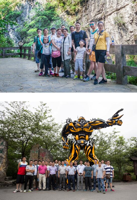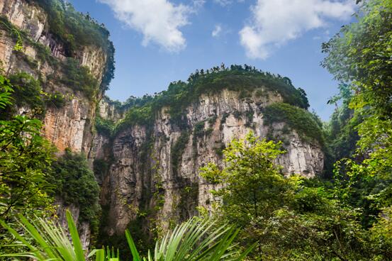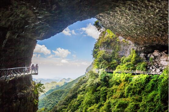 七月的山上居然像秋天一樣涼冷。風刮的特別大,還下了蒙蒙小雨,天哪,這氣溫相差也太大了吧!為了能增加一點溫度,我們便一路狂奔,不知不覺,我們跑進了一片竹林。這里非常幽靜,像鬼片里的密林,我和同事們停下跑動的腳步,慢慢的走著并大聲說著話給自己壯膽。終于,步行了1.5小時后,我們才繞出了樹林,來到懸崖上的步行梯上。這里真可怕,只要向下看一眼,心就“怦怦”地跳個不停。為什么說它可怕呢?因為這些步行梯全建在近百米高的懸崖半山腰上,上下都無著落點,我真的很難想像工人們是如何建成的這些供人們行走的臺階。我們快速的跑過這里,來到了一個幽深的黑洞里。這兒真涼快,不冷不熱,溫度剛剛好。于是大家停了下來,稍作休息后,繼續(xù)往前走。