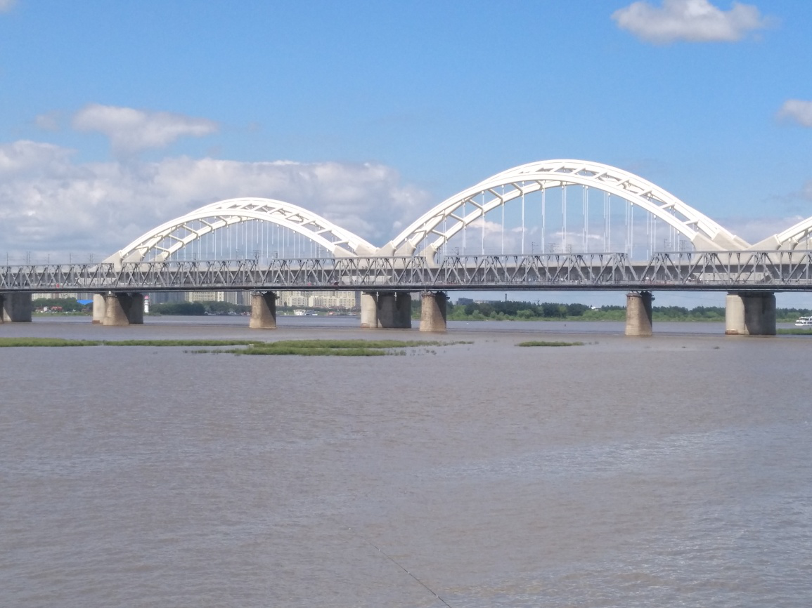 都說早起的鳥兒有蟲吃,早起果然看到不一樣的風(fēng)景。昨天晚上去的是界河廣場的右邊,今晨往左邊走,下面有一個長長的木棧道。穿過木棧道,再向界河挺進一些,竟然看到我們鮮艷的五星紅旗了,給我們莊嚴(yán)的國旗來一個特寫吧。你還想越過鐵絲網(wǎng)再往前走一點嗎?不行了,這里已經(jīng)是隔離帶了,越過鐵絲網(wǎng)過去就是“老毛子”——俄羅斯人的地盤了。