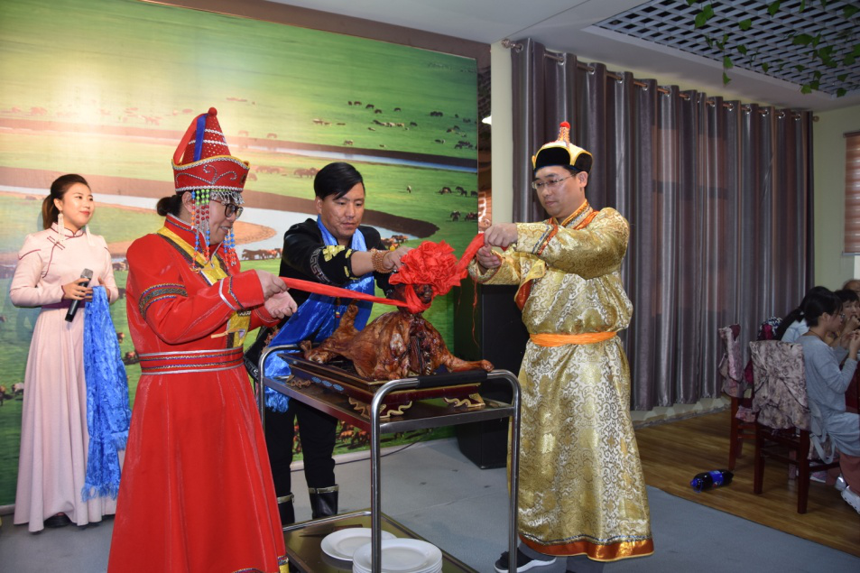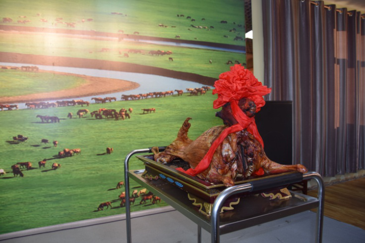 被隊友坑了一把,愣是穿了一回生平從未穿過的怪異民族服裝。我上臺在羊背上劃了一個十字刀,說是寓意著十全十美;又用無名指沾了酒杯中的酒向上彈一下,再向下彈一下;祭完天后,將酒一飲而盡。儀式結(jié)束,可以開始吃嘍!