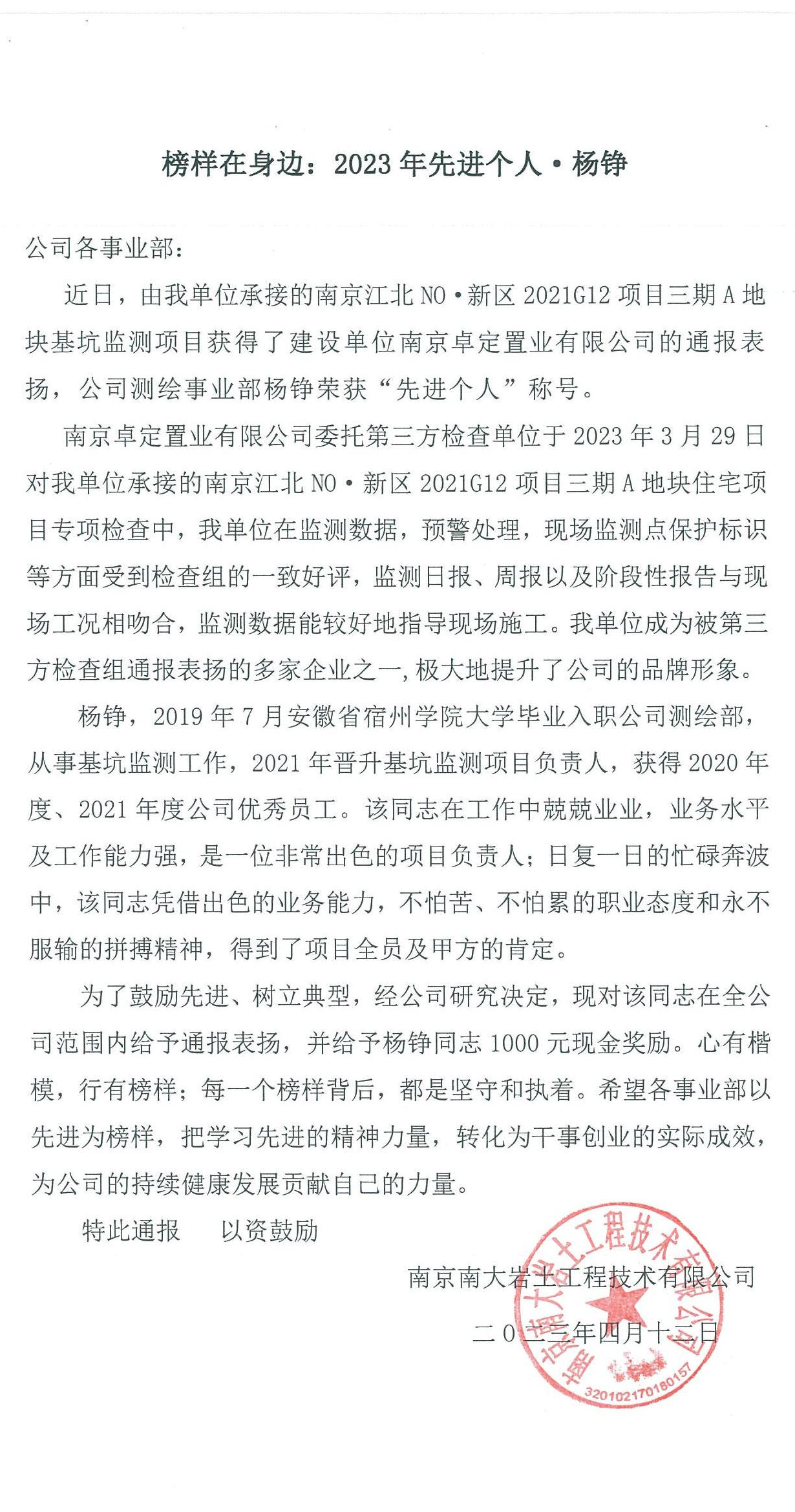 喜報(bào)“榜樣在身邊:2023年先進(jìn)個(gè)人·楊錚”